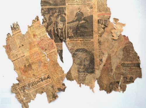 Bevor die Balken getauscht werden konnten, mussten die umliegenden Gefache geleert werden. Dabei sind wir auf die Reste einer Zeitung gestoßen. Ich kann nur vermuten, dass die Zeitung als Untergrund für die abschließende Tapete eingebaut wurde und so den Wanduntergrund gleichmäßig saugfähig machen sollte.