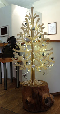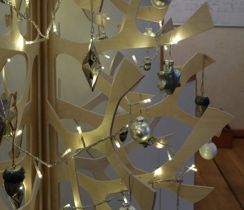 Der Baum besteht aus mehreren Holzteilen, die fächerförmig ineinandergesteckt werden. Ich finde, es ist ein ebenso simples wie geniales Prinzip. Muss man nur drauf kommen…