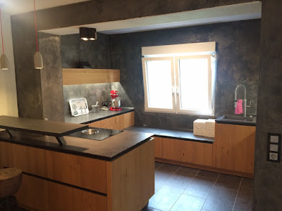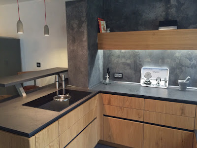 Es fehlte ihm eine Idee für die Wandgestaltung. Grobe Vorstellung: Beton. Wichtig: Die Wände müssen im Notfall abwischbar sein. Bitte nicht: ein klassischer Fliesenspiegel oder Glasplatten hinter den Arbeitsflächen.